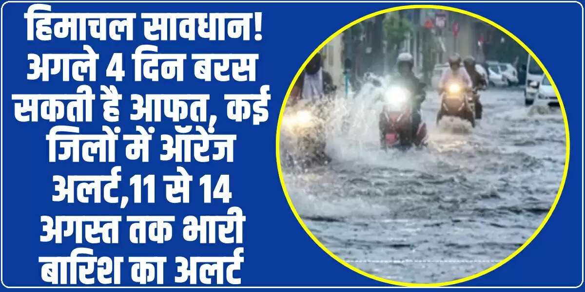 Himachal Weather update: शिमला: हिमाचल प्रदेश पर मॉनसून का संकट एक बार फिर गहराने वाला है। कुछ दिनों की राहत के बाद मौसम फिर से तीखे तेवर अपनाने जा रहा है। मौसम विज्ञान केंद्र शिमला ने प्रदेश में अगले 4 दिनों तक तबाही वाली बारिश की आशंका जताई है। इसे देखते हुए 11 अगस्त से लेकर 14 अगस्त तक के लिए अधिकांश जिलों में भारी से बहुत भारी वर्षा का ऑरेंज अलर्ट जारी कर दिया गया है।