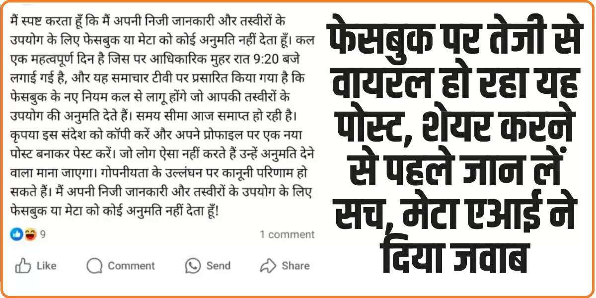 यह एक पुरानी अफवाह है जो हर कुछ महीनों में एक नए रूप में वापस आ जाती है। इस बार, मेटा के अपने आर्टिफिशियल इंटेलिजेंस (Meta AI) ने इस वायरल पोस्ट का सच बताते हुए जवाब दिया है। मेटा एआई ने साफ तौर पर कहा है कि यह एक आम अफवाह है जो अक्सर सोशल मीडिया पर फैलती है। फेसबुक या मेटा की पॉलिसी में ऐसा कोई बदलाव नहीं है जो आपकी तस्वीरों या निजी जानकारी को इस्तेमाल करने की परमिशन देता हो। मेटा की प्राइवेसी पॉलिसी पहले से ही साफ है और यूजर्स को अपनी प्राइवेसी सेटिंग्स को कंट्रोल करने की पूरी सुविधा देती है। इस तरह के संदेश को कॉपी और पेस्ट करने की कोई आवश्यकता नहीं है।