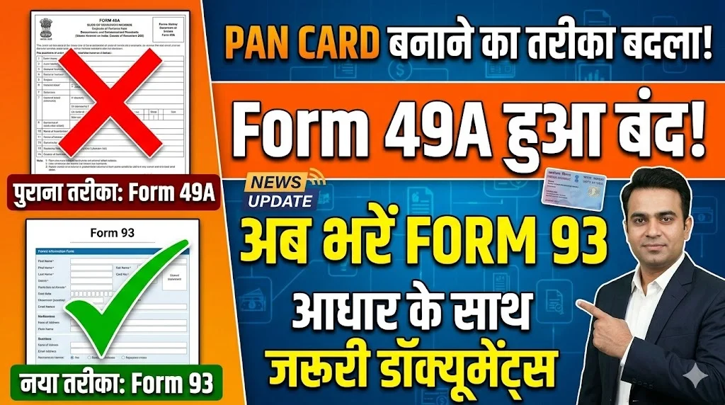 PAN Card Form 93 Apply 2026: नया पैन कार्ड बनाने का बिल्कुल नया तरीका आ गया है। अब आपका जो नया पैन कार्ड बनेगा, वह सिर्फ आधार कार्ड से नहीं बनेगा। सरकार ने नया पैन कार्ड बनाने के लिए नया फॉर्म जारी कर दिया है। यानी नया पैन कार्ड पहले बनाने के लिए फॉर्म 49A भरना होता था, लेकिन अब सरकार ने नए पैन कार्ड के लिए फॉर्म 93 जारी कर दिया है। यानी फॉर्म आपको 93 भरना होगा तभी आपका नया पैन कार्ड बनेगा। अब नया पैन कार्ड सिर्फ आधार कार्ड से नहीं बनेगा, आधार कार्ड के साथ में आपको एज प्रूफ का एक डॉक्यूमेंट लगाना होगा।