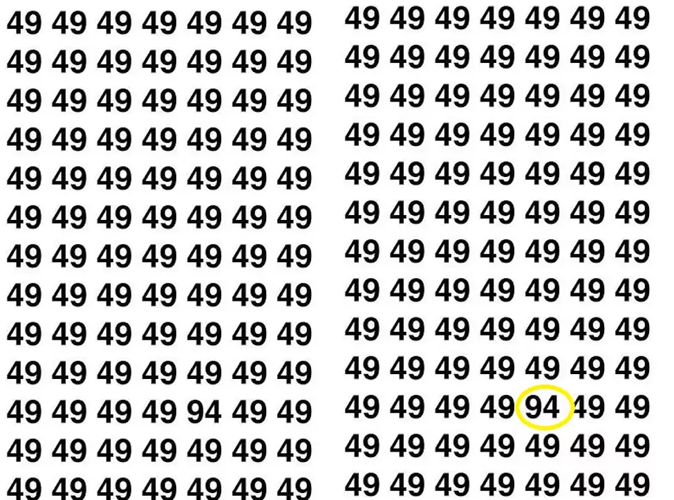 इस तस्वीर में कई बार 49 लिखा हुआ है, लेकिन इन्हीं के बीच एक 94 (Ninety-Four) भी छिपा हुआ है। आपकी चुनौती (Challenge) यही है कि इसे 10 सेकंड (Seconds) में ढूंढकर बताएं। अगर आप ऐसा कर पाते हैं, तो आपका आईक्यू (IQ) वाकई बहुत तेज है!